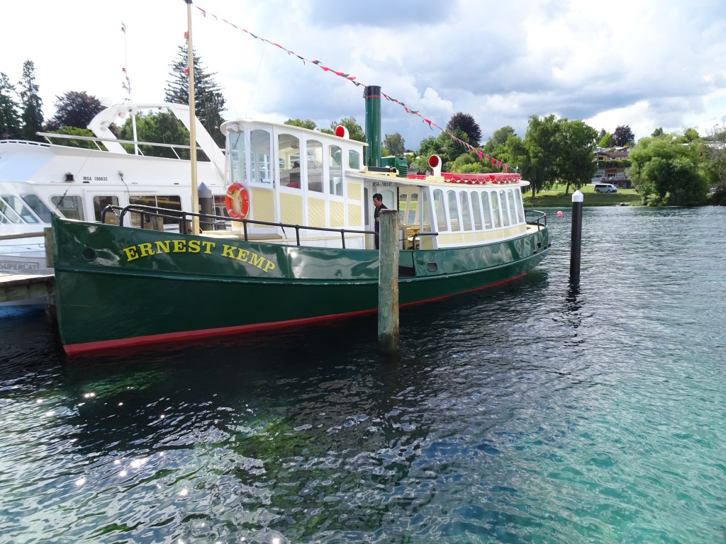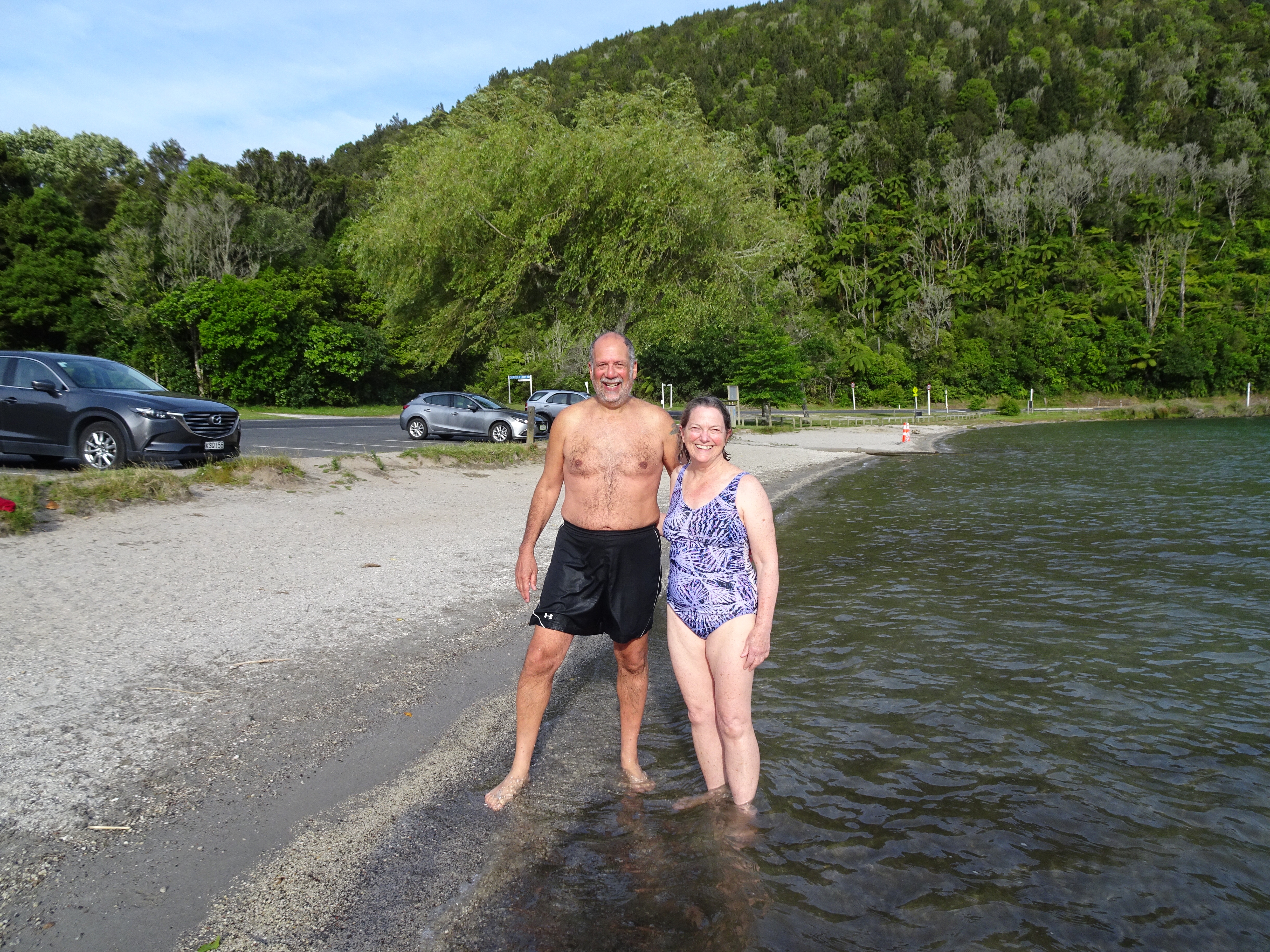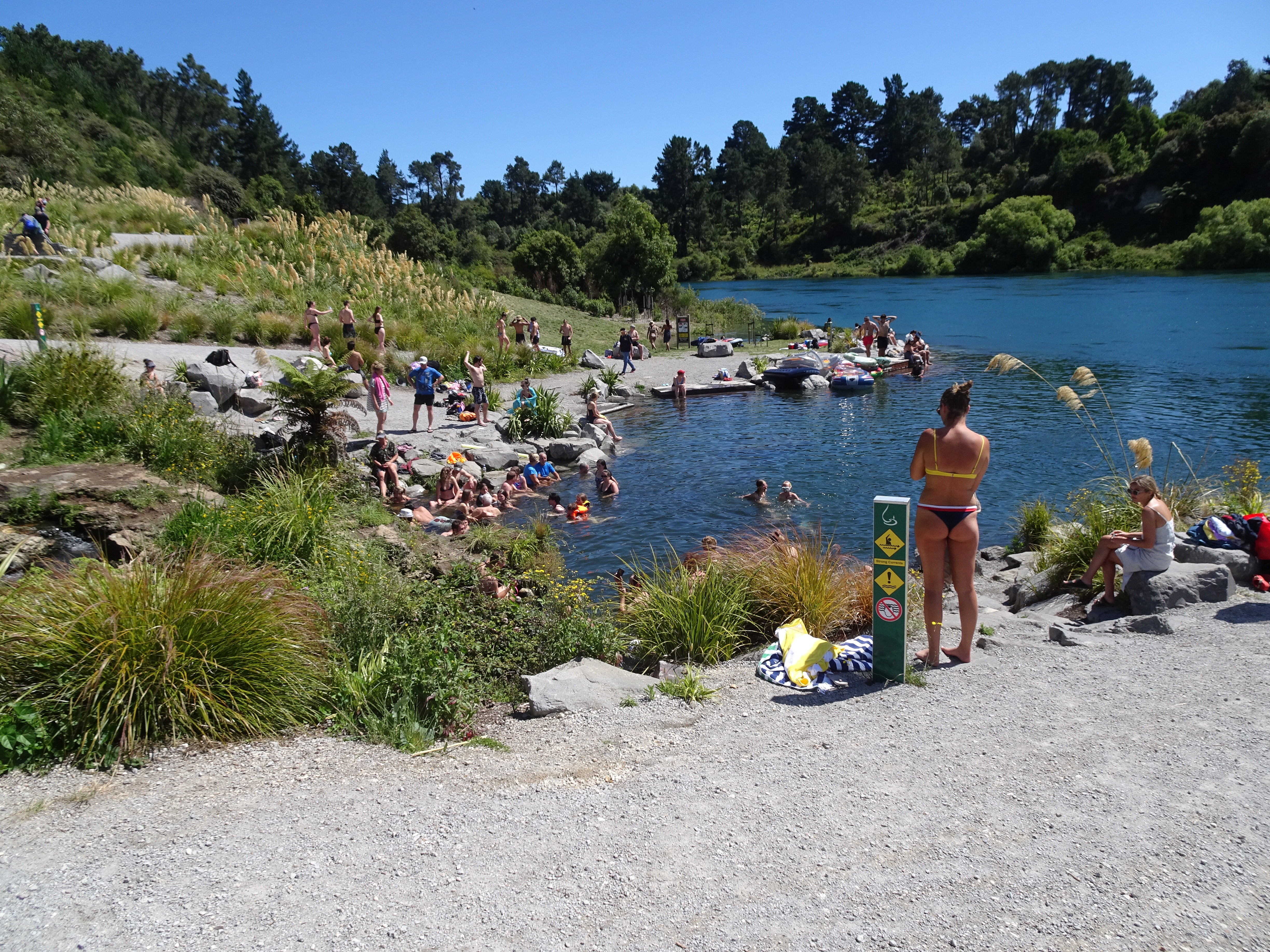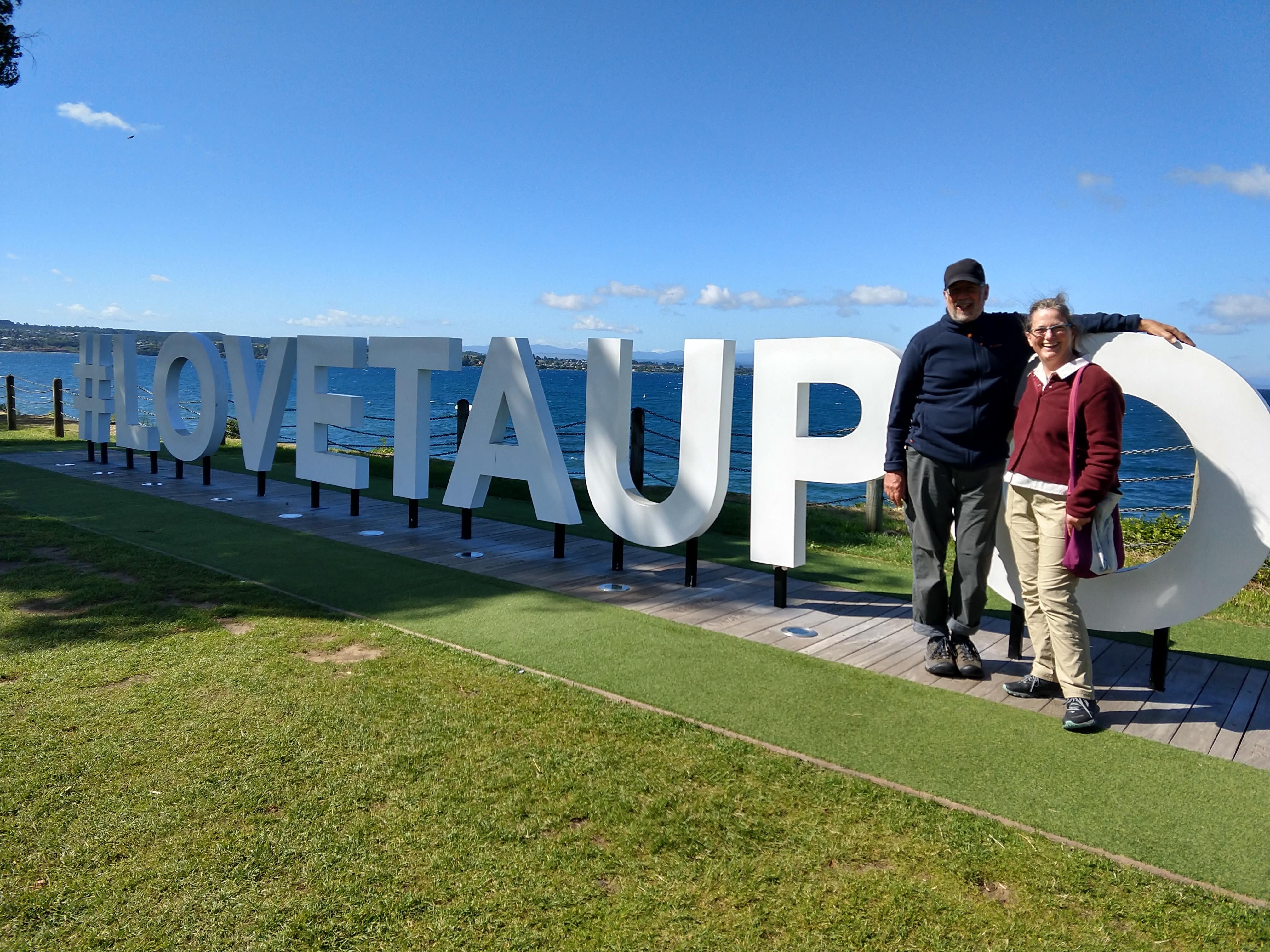 Taupo is just down the road, about an hour south of Rotorua. It also is in the geothermal region. The town is on the banks of Lake Taupo, the largest lake in New Zealand. The Waikato River flows out of the lake, and it is the largest river in New Zealand, flowing up to Auckland. We took an evening boat ride out into the lake to Maori carvings, then the next day we kayaked up the river. The water is some of the clearest that we’ve ever seen. It seems as clear as Waldo Lake, in the Oregon Cascades, which is one of the clearest in the world.