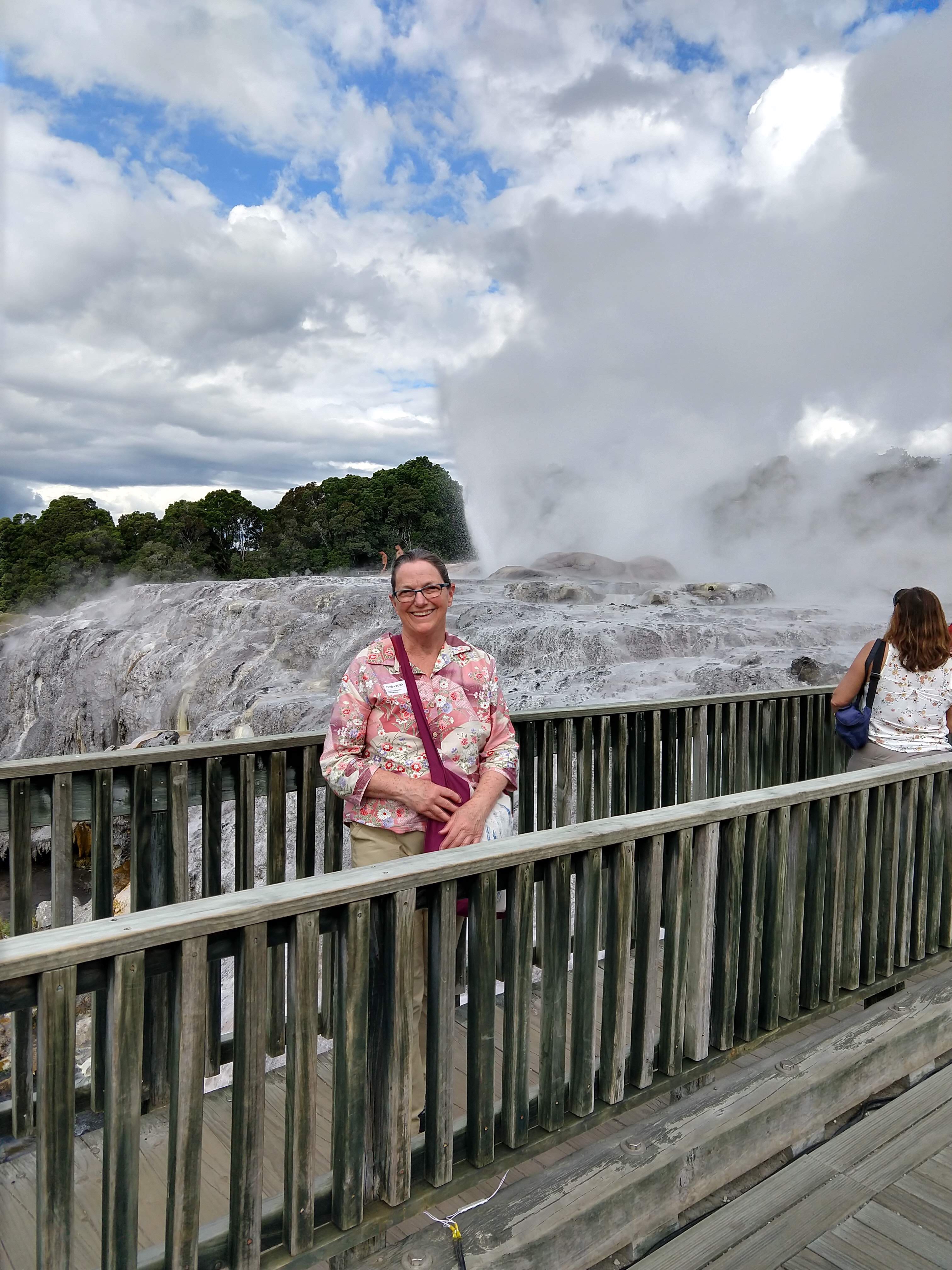 Pohutu Geyser behind Monica. It shoots steam 100 feet up, and sometimes erupts continually for days at a time. This is in the Te Puia Cultural Center.