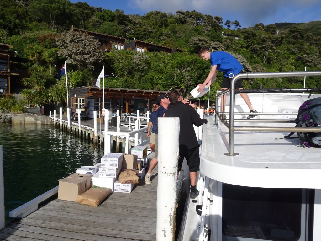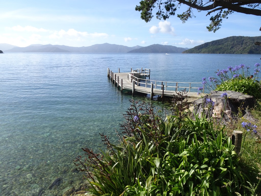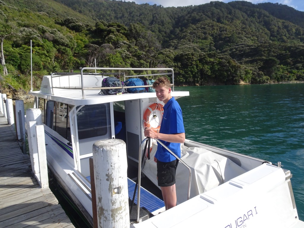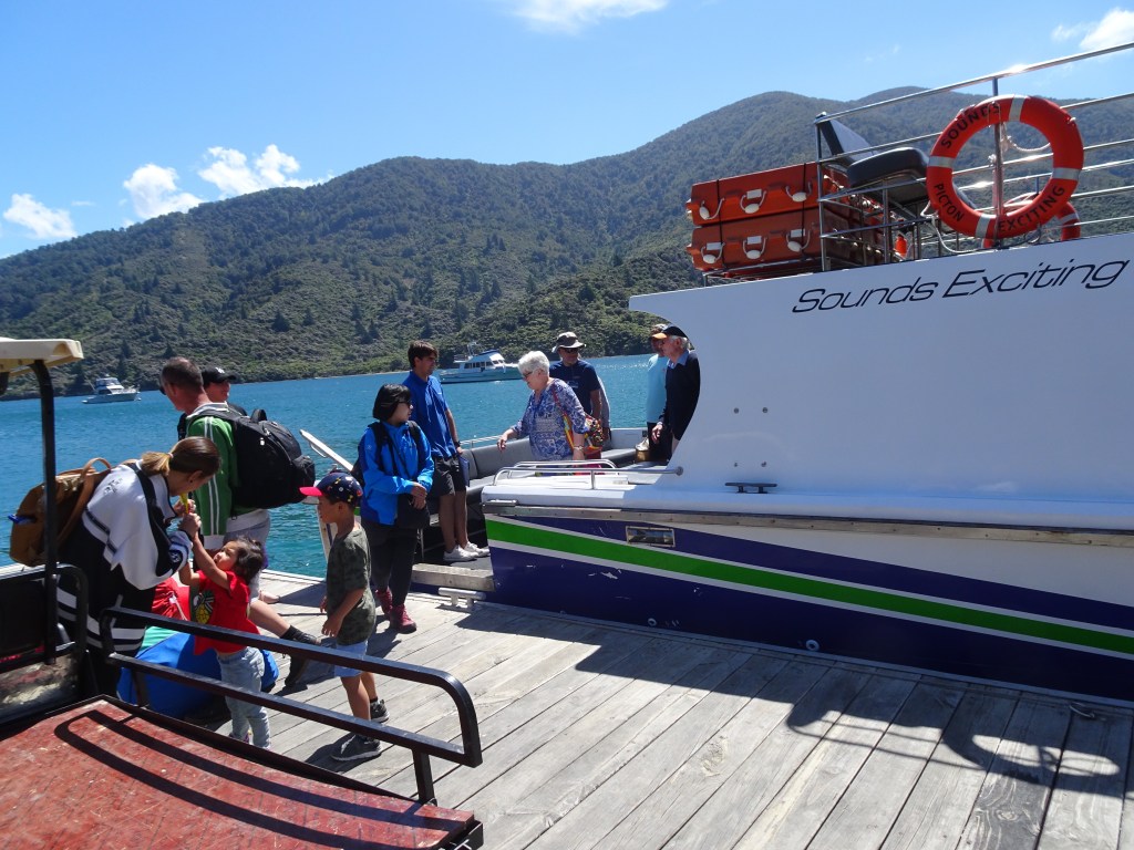 New Zealand has nine “great walks.” The Queen Charlotte is one of them. You can walk the whole trail in five days, using the water taxis to transfer your pack for you, staying in lodges with hot showers and meals and beds every night. The water taxis are a fantastic system which you can use to hike any part of the trail that you’d like to. We chose to hike from Resolution Bay to Furneaux Lodge, a total of ten kilometers, a pleasant day hike. We got on the boat at 8:00 in the morning, and started hiking at 9:15. The Sound is calm protected water, the boat ride was smooth, and the weather was delightful.