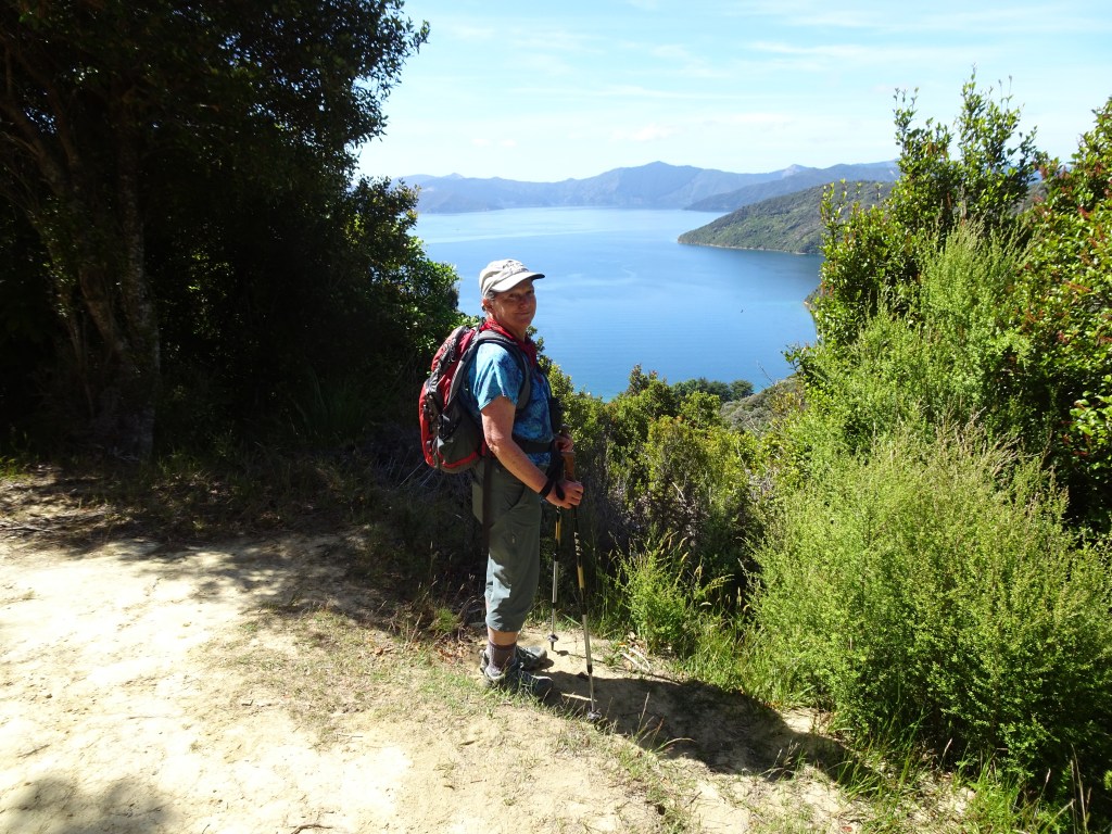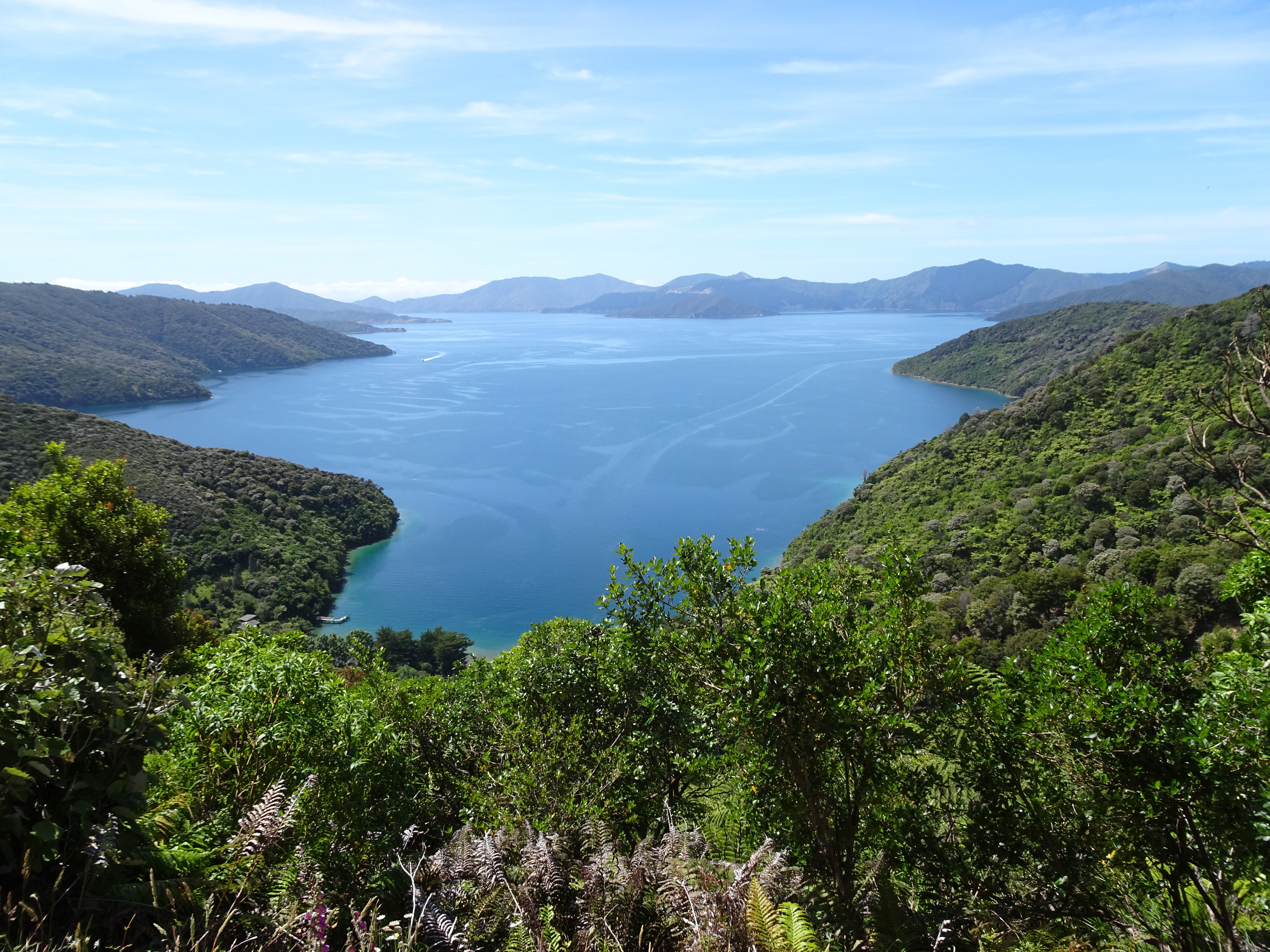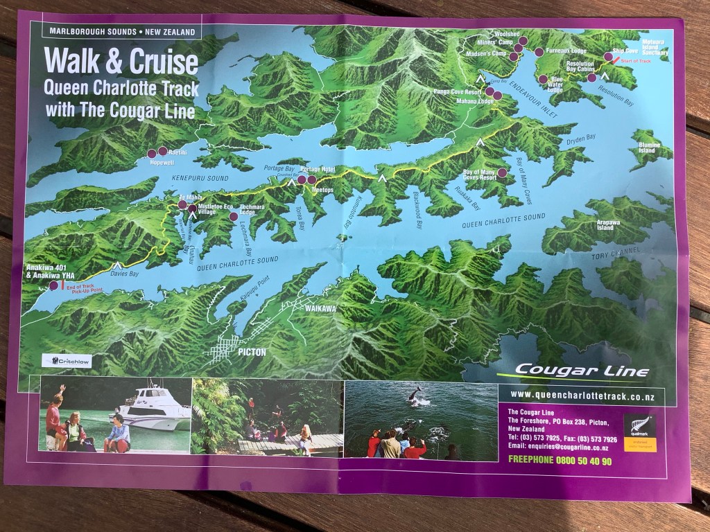The Queen Charlotte Track is a seventy two kilometer hiking trail that runs along the Queen Charlotte Sound. The sound is an inlet from the Cook Strait, and the town of Picton is at the end of it. That’s where the ferry connects to the North Island. This whole area is in the Marlborough Region. Marlborough is famous wine country, but these inlets and bays of the Marlborough Sound are spectacular. Straightened out, this little area has 25% of New Zealand’s total coastline.