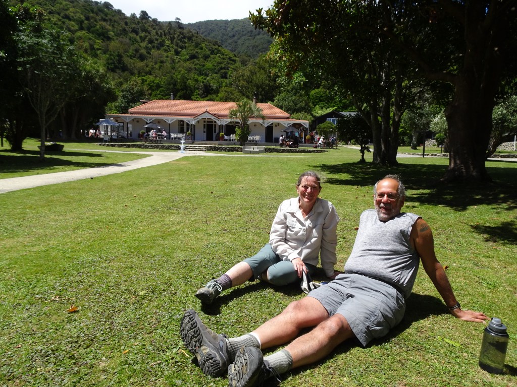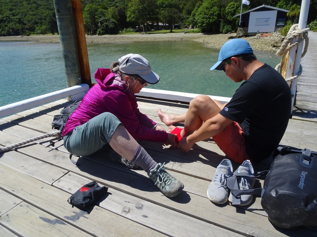 We reached our destination with an hour to spare. It was great to lounge a bit after the hike. We had met a family from Auckland in the morning, and we saw them again at the end. The dad (Ethan) had sprained his ankle on the walk, and Monica finally got to use some first aid to help him out.