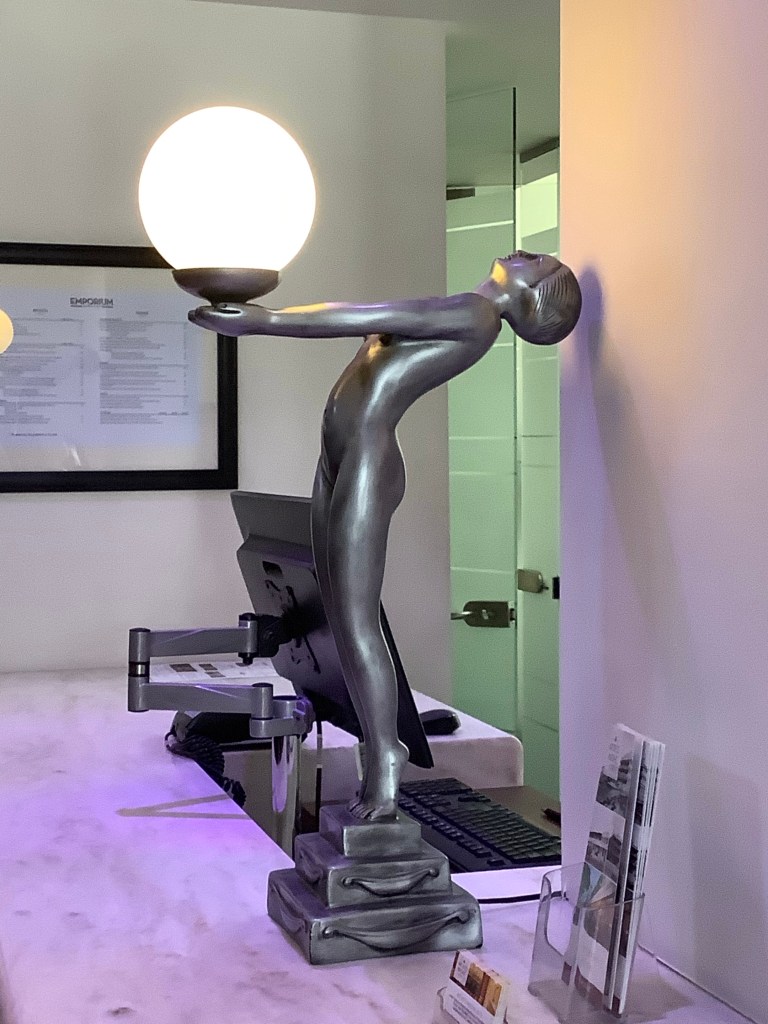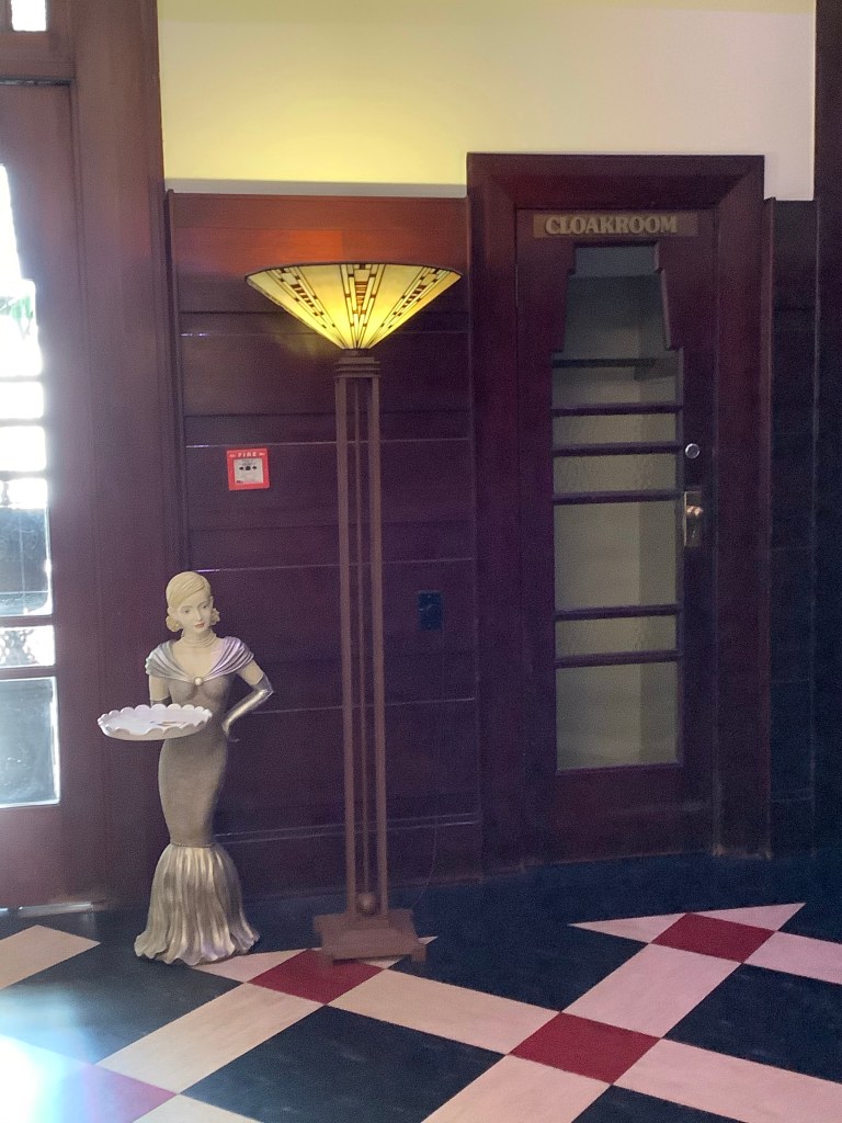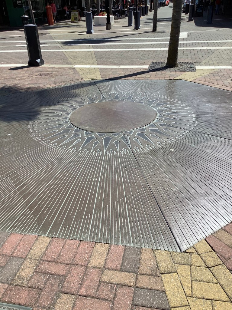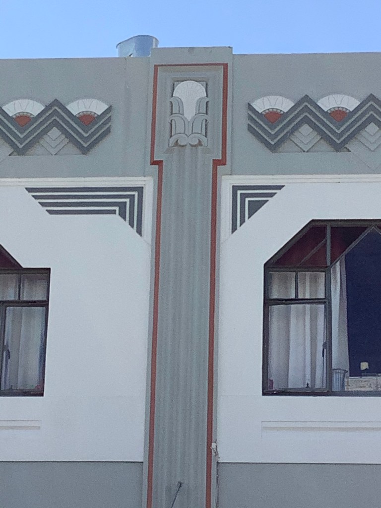 Art Deco is a style of design that flourished in the inter-war years, capturing the spirit of modernism and optimism that followed the First World War. I, Monica, signed up for a city walking tour our second day in Napier and received an art history course as well as a ramble through town. Features of Art Deco are geometric motifs, rich ornamentation and bright colors. Design themes were drawn from European art, new technologies, and new archeological findings such as the then recent opening of Tutankhamen’s tomb.